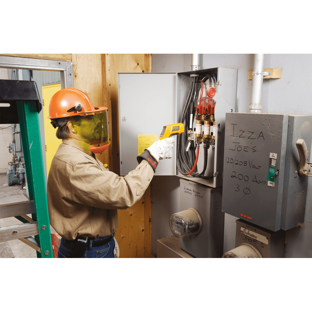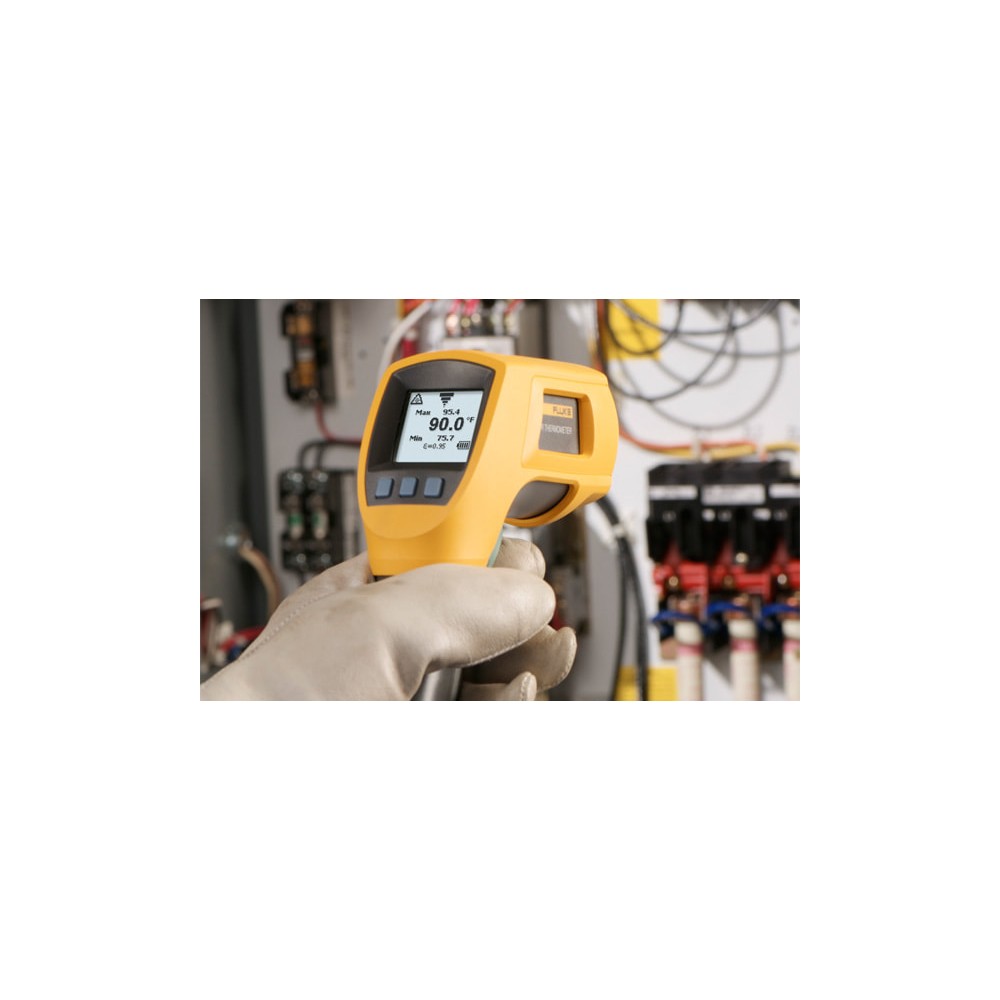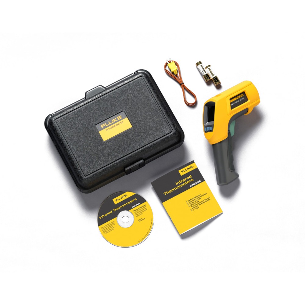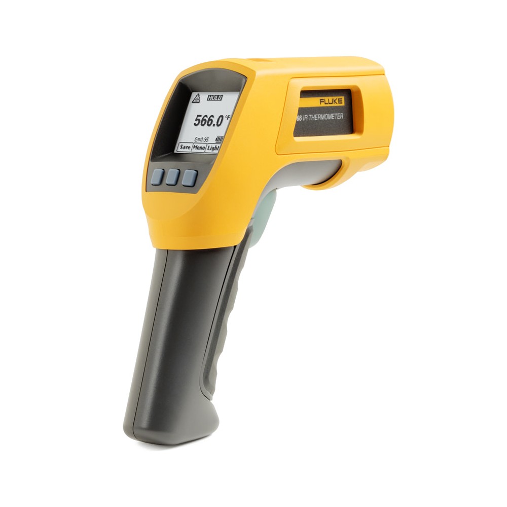 Пирометр Fluke 566 объединяет два способа измерения температуры в одном устройстве: бесконтактный инфракрасный и контактный с помощью встроенного шарового зонда на базе термопары типа K. Это позволяет точно оценивать как поверхность горячих объектов на расстоянии, так и температуру внутри оборудования — например, под кожухом или в труднодоступных точках.